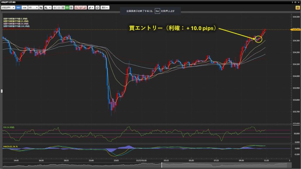 【00005】2025/11/12 ③ 利確(通算:5勝0敗0分) 2025年11月 2025.11.18 2025.11.12 【取引結果】 取引通貨:USD/JPYロット数:4損益:+ 10.0 pips (+ 4,000円)資産:266,000 → 270,000円本日勝敗:3勝0敗0分通算成績:5勝0敗0分